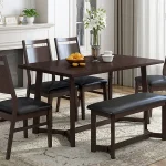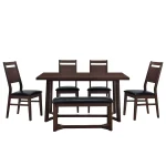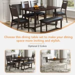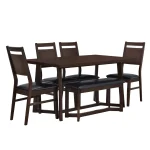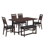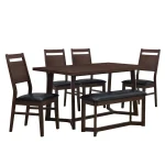 - [6-Piece Dining Set] Gather your family and friends for a meal at this stylish rectangular dining table set. The set includes four sturdy dining chairs, as well as a comfortable bench that can accommodate additional guests. With enough space to comfortably seat up to five individuals, you’ll have plenty of room to enjoy your meals, and you can easily add more chairs if you have company.