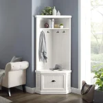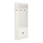 Whether your decor style is coastal cottage or traditional, the Seaside Corner Hall Tree is a great addition to any entryway or mudroom. Simple molding and beadboard paneling form a classic coastal look, while four metal hooks create functional coat rack. The base of the hall tree makes features a storage cabinet with hinged door and removable shelf, perfect for use as an entryway shoe bench. With its slim corner hugging design and variety of storage options, the Seaside Corner Hall Tree helps you stay organized without overwhelming your living space.