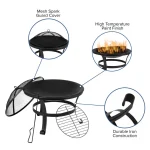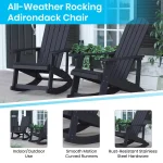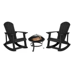Set of 2 Poly Resin Adirondack Rocking Chairs with 22″ Wood Burning Fire Pit Black Polyresin Frame Color Extra Wide Back, Seat, & Arms with Vertical Lattice Back and Slanted Seat All Weather Polystyrene Frame is UV Treated; Won’t Rot, Peel, or Splinter Arm Size: 25.5″H from floor; 7.5″H from seat Iron Construction Fire Pit with Stabilizing Leg Band; 5″ Deep Bowl Finish Protecting High Temperature Paint Included Mesh Spark Screen, Grate, and Poker Screen Size: 20″W x 20″D x 8″H; Interior Depth: 5″; Poker Size: 15.25″D Clean Exterior with a Mild Dishwashing Detergent or Citrus Based Degreaser and Nylon Scrub Brush
